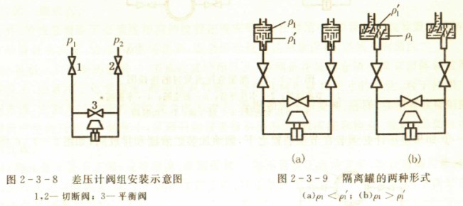 ③如果差压计必须装在节流装置之下,则须加装贮液罐和排放阀,如图2-3-6所示。
