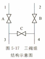 三阀组是差压变送器最常用的附件。三阀组就是将气个针形阀组合成一体,由高导压例A、低导压阀B和平衡阀C组成。如图5-17所示。由于其结构简单,面且很多三阀组上、下接头尺寸一样且对称,有的厂家又没有标示安装方向,这样在安装使用中稍有硫忽,就会出现一些问题,如上、下方向装反了,导致变送器工作失常。